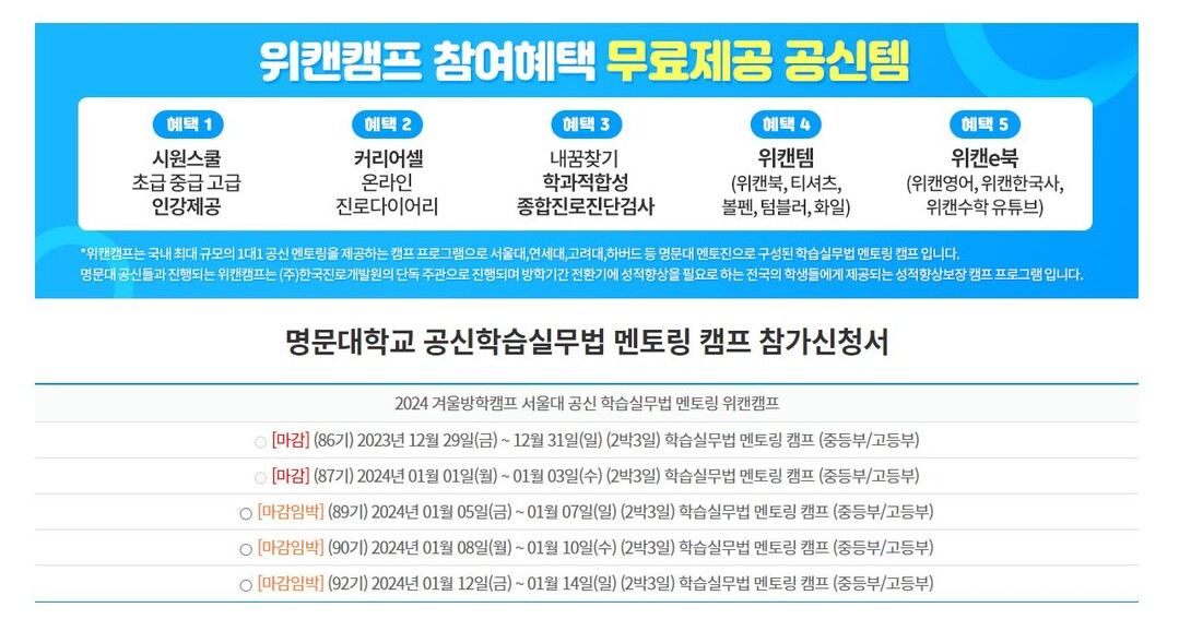 위캔캠프 공식 홈페이지에서 이번 겨울방학 공신캠프 참가 신청이 가능하다.