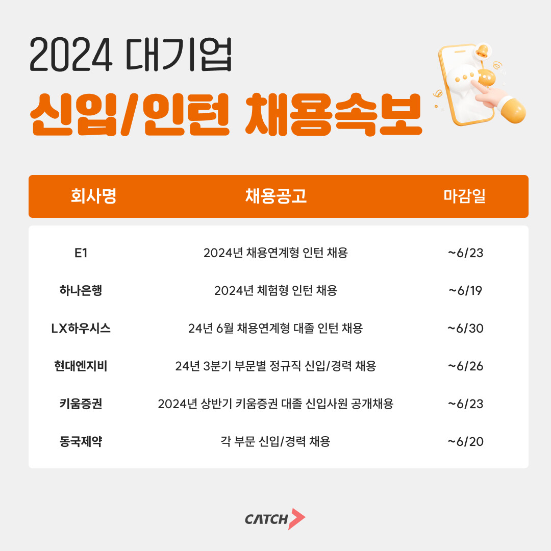 [피앤피뉴스=마성배 기자] 진학사 캐치가 13일 E1, 하나은행, LX하우시스, 현대엔지비, 키움증권, 동국제약 등 주요 기업들의 신입 및 인턴 채용 소식을 전했다.