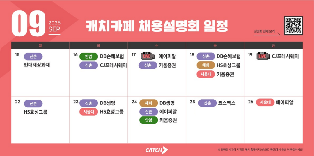 진학사 캐치는 9월 셋째·넷째 주 ‘캐치카페’에서 현대해상화재, DB손해보험, DB생명, CJ프레시웨이, APR, 키움증권, HS효성, 코스맥스 등 굵직한 기업들이 잇따라 채용설명회를 연다고 11일 밝혔다.