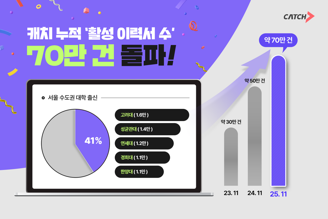 기업 매칭이 가능한 최신 이력서 비중이 높다는 점도 주목된다. 캐치에 따르면 최근 1년 6개월 내 업데이트된 이력서가 전체의 약 60%를 차지해, 실제 구직 활동 중인 인재 중심으로 인재 풀이 강화되고 있다는 분석이다.