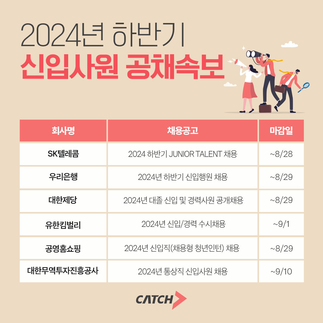 [피앤피뉴스=마성배 기자] 진학사 캐치가 21일 SK텔레콤, 우리은행, 대한제당, 유한킴벌리, 공영홈쇼핑, 대한무역투자진흥공사 등 주요 대기업 및 공공기관들이 하반기 신입사원 공채에 돌입했다고 21일 밝혔다.