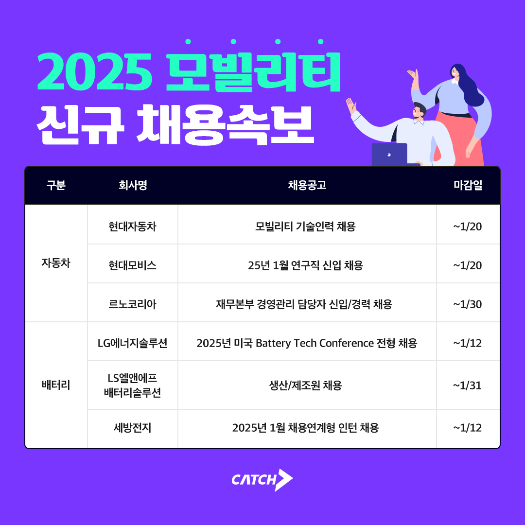 [피앤피뉴스=마성배 기자] 진학사 캐치는 8일 2025년 모빌리티 산업 주요 기업들이 대규모 신규 채용에 나섰다고 밝혔다. 이번 채용에 참여하는 기업은 현대자동차, 현대모비스, LG에너지솔루션, 르노코리아, LS엘앤에프배터리솔루션, 세방전지 등으로, 다양한 직군에서 인재를 모집하고 있다.