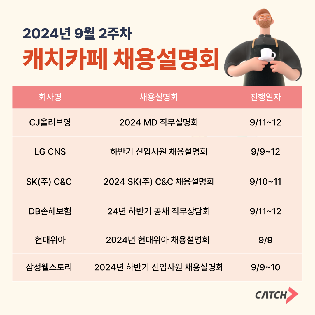 캐치카페에서 진행되는 설명회에는 CJ올리브영, LG CNS, SK(주) C&C, DB손해보험, 현대위아, 삼성웰스토리 등 주요 기업들이 참여할 예정이다.