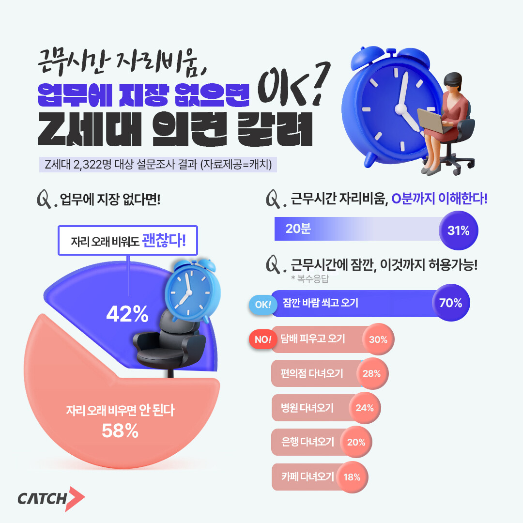 진학사 캐치가 Z세대 2,322명을 대상으로 4월 11일부터 17일까지 ‘업무에 지장이 없다면, 근무시간에 자리를 오래 비워도 괜찮은지’에 대한 의견을 물은 결과, ‘자리를 비우면 안 된다’는 의견이 58%, ‘비워도 괜찮다’는 의견이 42%로 집계돼, 근무 중 자리를 비우는 행위에 대한 의견이 팽팽하게 갈린 것으로 나타났다.