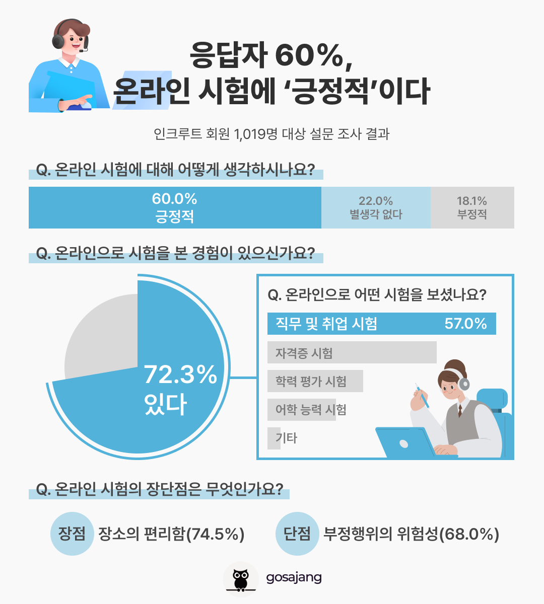 조사 결과 응답자의 60%가 온라인 시험을 긍정적으로 평가했으며, ‘부정적’이라는 답변은 18.1%에 그쳤다. 나머지 22.0%는 별다른 생각이 없다고 답했다.