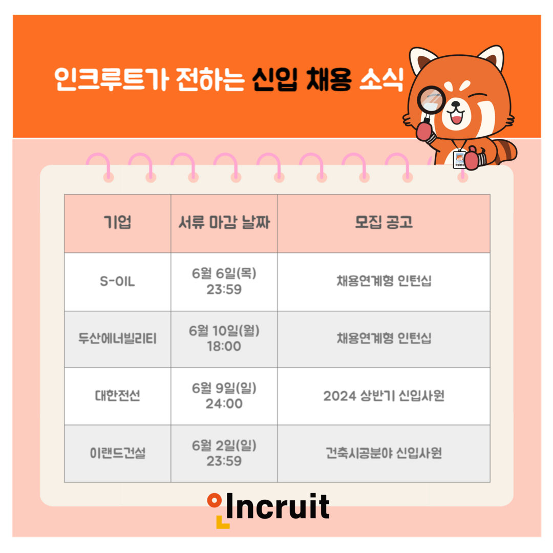 [피앤피뉴스=마성배 기자] 인크루트(대표 서미영)가 30일 신입 구직자들을 위해 S-OIL, 두산에너빌리티, 대한전선, 이랜드건설 등 주요 기업의 신입 채용 공고를 전했다.