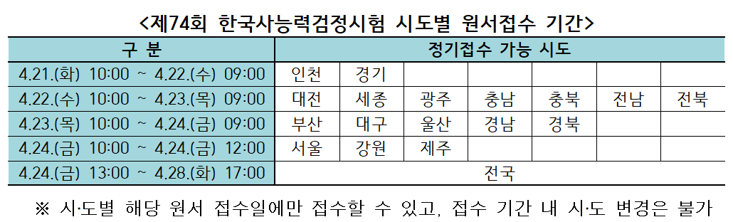 다음 회차인 제78회 한국사능력검정시험은 5월 23일(토)에 실시된다. 원서접수는 4월 21일부터 24일까지 시·도별로 나눠 진행되며, 이후 4월 28일까지 전국 단위 접수가 이어진다. 정기접수 취소 좌석에 대한 추가 접수는 5월 5일부터 8일까지 가능하다.