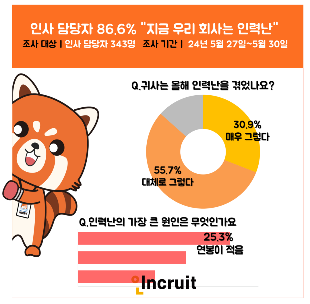 설문조사에 따르면, 한국 기업의 인사 담당자 343명 중 86.6%가 올해 인력난을 겪고 있는 것으로 나타났다. 응답자 중 30.9%는 ‘매우 그렇다’고 답했으며, 55.7%는 ‘대체로 그렇다’고 답해 인력난이 심각한 수준임을 보여줬다.