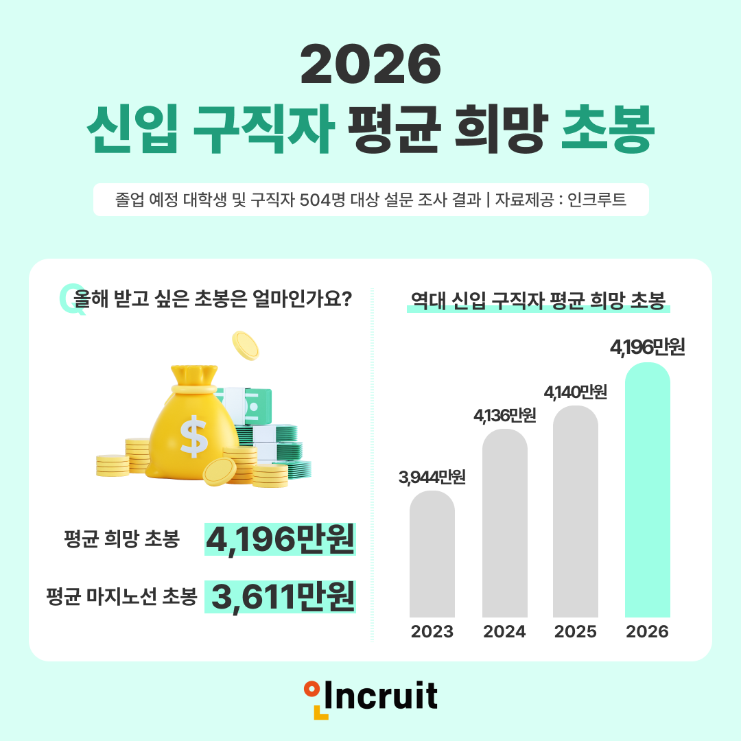 인크루트가 졸업 예정 대학생과 구직 희망자 504명을 대상으로 조사한 결과, 올해 신입 구직자의 평균 희망 초봉은 4196만 원으로 집계됐다. 지난해(4140만 원)보다 56만 원 상승한 수치다.