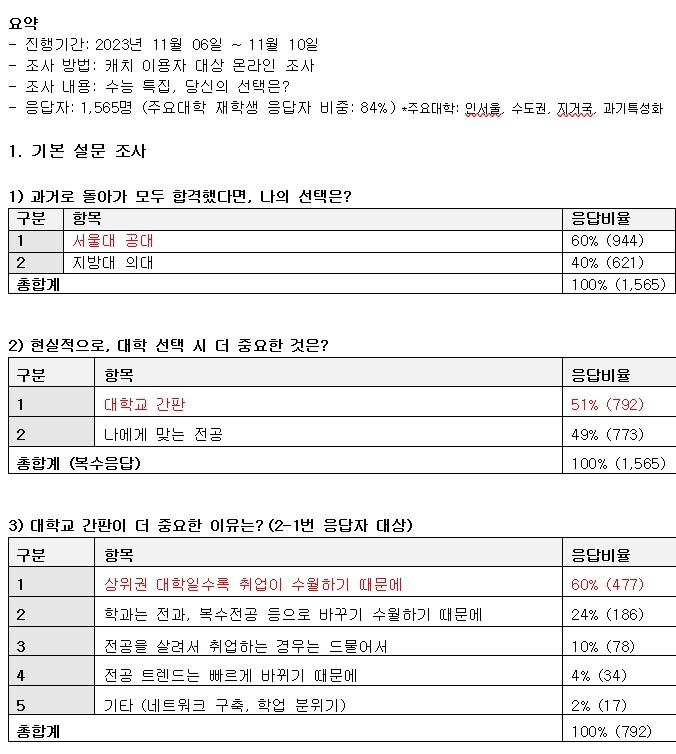 진학사 캐치는 15일에 수능 특집으로 상위권 대학 취준생 1,565명에게 만약 수험생으로 돌아간다면 ‘서울대 공대 vs 지방대 의대’를 주제로 설문조사를 진행했다. 그 결과, ‘서울대 공대’를 선택한 대학생이 10% 더 우세한 것으로 나타났다.