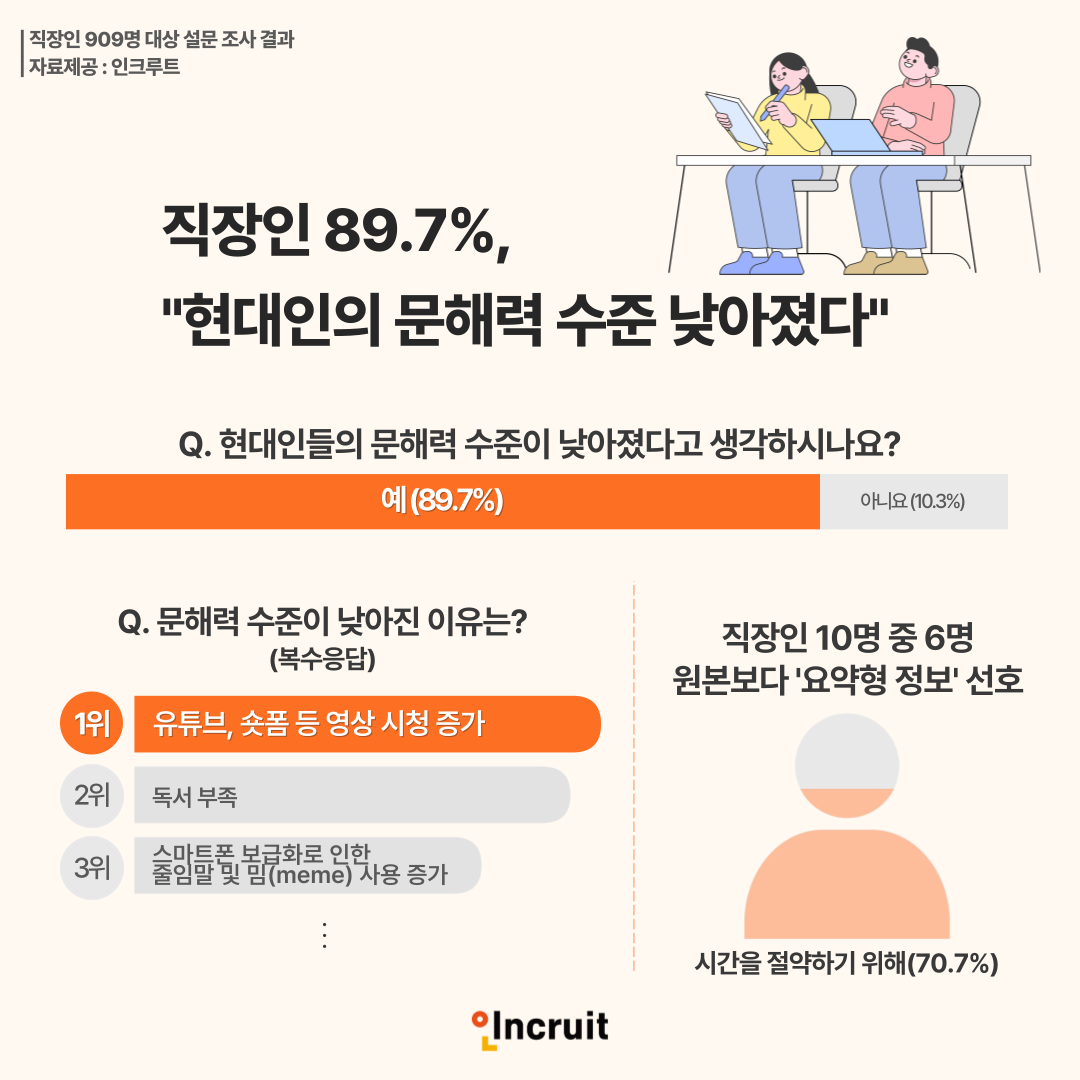 직장인 909명을 대상으로 9월 30일부터 10월 3일까지 진행된 이번 조사에서, 직장인 10명 중 9명이 현대인들의 문해력 수준이 낮아졌다고 답해 문해력 문제가 광범위하게 인식되고 있음을 보여주었다.