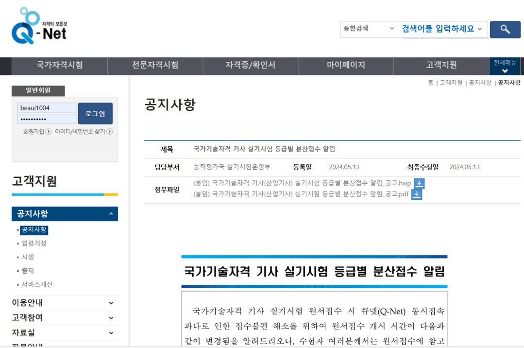 지난 1월 23일부터 26일까지 진행된 2024년도 정기 기사 제1회 시험 원서접수 기간 동안 한국산업인력공단이 운영하는 원서접수 누리집(큐넷)의 접속 지연으로 인해 대기시간이 2시간 이상 발생하고, 접수 진행 중 임의로 로그아웃되는 등의 오류가 발생했으며, 이로 인한 접속 지연 문제로 일부 지역에서는 시험장소 부족 문제가 발생하는 등 수험자들에게 큰 불편을 초래했다.