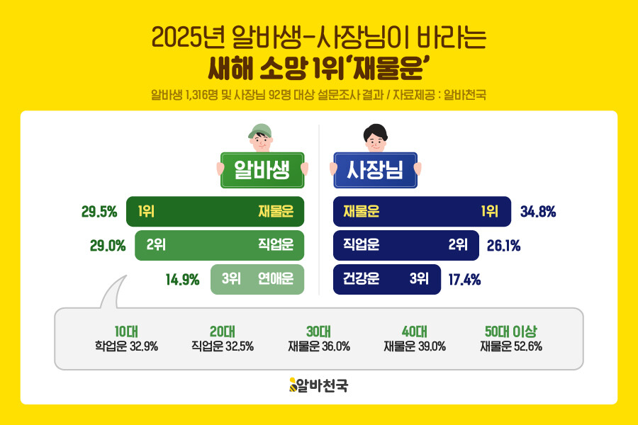 [피앤피뉴스=마성배 기자] 2025년 새해를 맞아 아르바이트생과 사장님 모두가 가장 바라는 소망으로 ‘재물운’을 꼽았다. 구인구직 아르바이트 전문 포털 ‘알바천국’이 알바생 1,316명과 사장님 92명을 대상으로 실시한 설문조사 결과, 양측의 목표와 전망이 다소 엇갈리며 서로 다른 시각을 드러냈다.