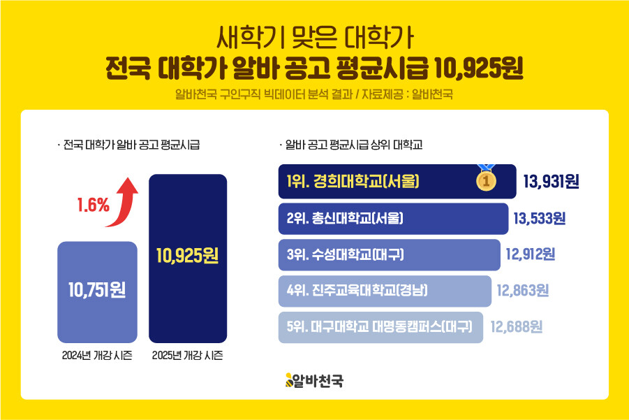 [피앤피뉴스=마성배 기자] 새학기를 맞은 대학가 아르바이트 시장이 달아오르고 있다. 구인구직 포털 알바천국이 3일 발표한 ‘2025 대학가 알바 현황’ 분석에 따르면, 최근 한 달간 전국 대학가 아르바이트 공고의 평균 시급은 1만925원으로 나타났다. 이는 2025년 법정 최저임금(1만30원)보다 895원 높은 수준이다.