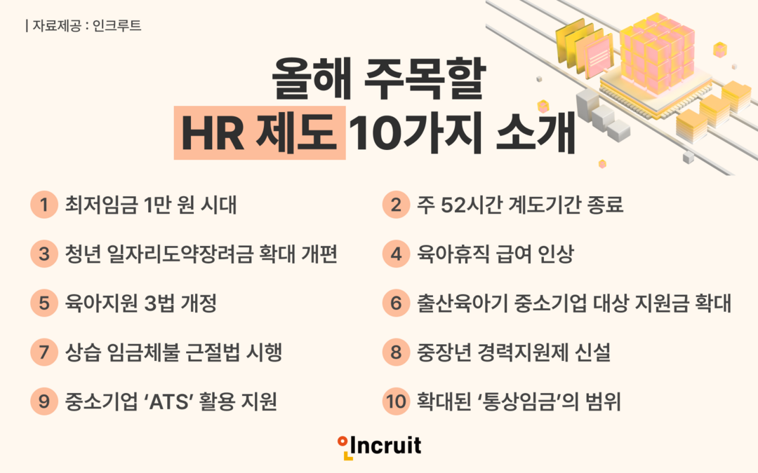 [피앤피뉴스=마성배 기자] HR테크 기업 인크루트(대표 서미영)가 2025년 주목해야 할 10가지 HR 제도를 발표했다. 올해는 최저임금 1만 원 시대가 열리고, 육아휴직과 청년·중장년 일자리 지원이 대폭 확대되는 등 노동시장 전반에 걸쳐 큰 변화가 예상된다.