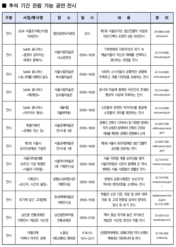 서울시는 이번 추석 연휴 동안 서울시립미술관, 서울공예박물관 등 주요 문화시설을 휴무 없이 운영하며, 시민들이 다양한 문화 행사를 즐길 수 있도록 할 예정이다. 자세한 정보는 각 기관의 누리집이나 서울문화포털에서 확인할 수 있다.