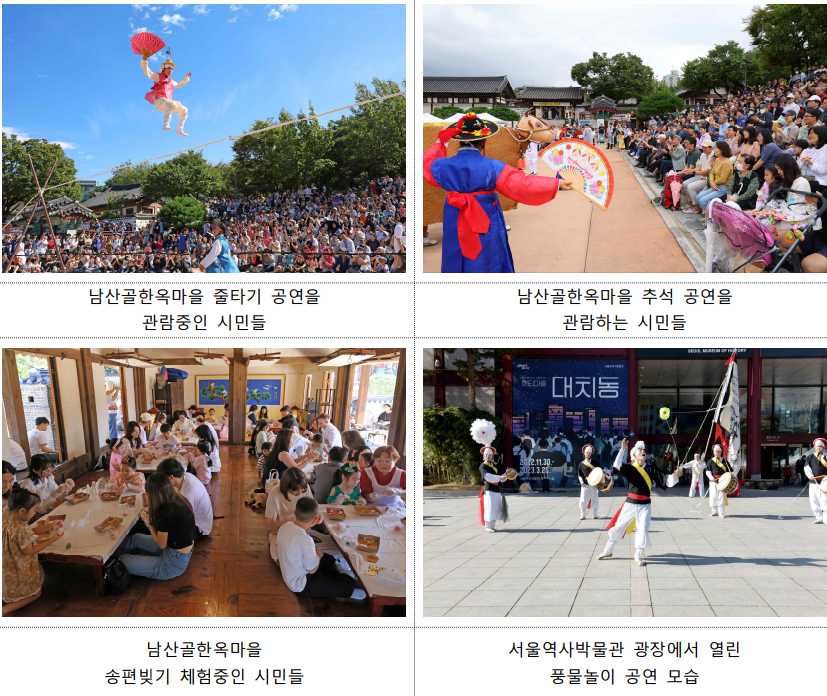 서울의 대표 전통 문화공간에서도 추석을 맞아 전통 세시풍속 체험을 즐길 수 있는 프로그램이 진행된다. 남산골한옥마을에서는 ‘남산골한가위축제 삼삼오락’(9월 15일~18일)이 개최되며, 강강술래, 공동 차례상, 전통주 나눔 등의 행사가 펼쳐진다(매일 10:00~17:00).