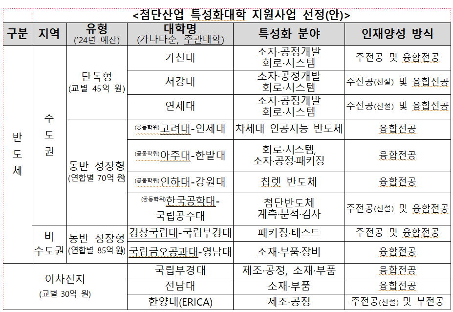 올해에는 이차전지 분야를 추가하여 반도체 분야 9개, 이차전지 분야 3개 총 12개 대학(연합)이 선정되었다.