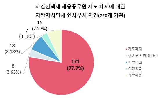 전국시간선택제공무원노동조합(시선제노조)이 2월 한 달간 전국 243개 지자체 인사부서를 대상으로 실시한 설문조사에서, 회신한 220개 기관 중 171개(77.7%)가 ‘제도 폐지’를 희망한다고 답변한 것으로 나타났다.