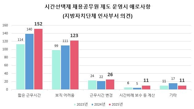 또한 보직 부여의 어려움을 지적한 기관도 123개(55.9%)로, 지난해보다 24개 기관이 늘었다. 각 지자체 인사부서는 별도의 성과 평가, 현원 관리, 보수·수당 지급 등 행정적 부담이 가중되고 있으며, 근무시간이 짧아 동료 직원들에게 업무 부담이 전가되고 있다고 지적했다.