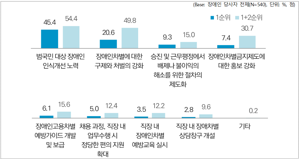 차별 예방을 위해 필요한 조치로는 기관과 장애인 모두 ‘범국민 장애인 인식개선’(기관 50.9%, 장애인 45.4%)을 1순위로 꼽았다. 그 외 ▲관련 법·제도 홍보(기관 22.6%, 장애인 17.6%) ▲접근성 가이드라인 보급(기관 16.4%, 장애인 12.8%) 등이 뒤를 이었다.