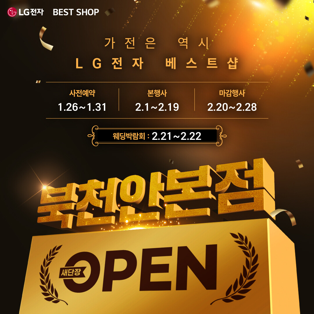 LG전자 베스트샵 북천안본점 새단장 오픈 행사는 본행사(2월 1일~19일)를 시작으로 마감행사(2월 20일~28일)까지 순차적으로 실시된다. 또한 2월 21일부터 22일까지는 웨딩 고객을 대상으로 한 웨딩박람회가 함께 진행돼 혼수가전 상담을 원하는 예비부부들의 방문이 예상된다.