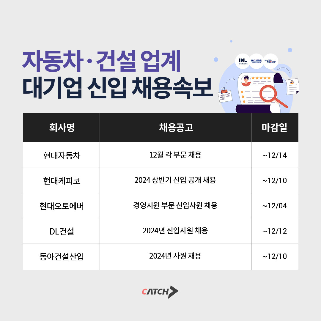 [피앤피뉴스=마성배 기자] 진학사 캐치는 자동차·건설 업계 신입사원 채용이 활발하다고 30일 밝혔다.