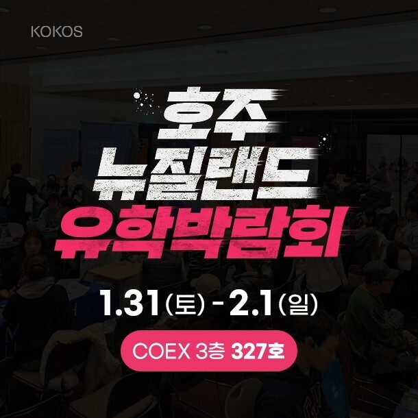 호주&뉴질랜드 전문 유학원 ㈜코코스유학이 오는 1월 31일(토)부터 2월 1일(일)까지 서울 코엑스 3층 327호에서 ‘호주&뉴질랜드 유학박람회’를 개최한다.