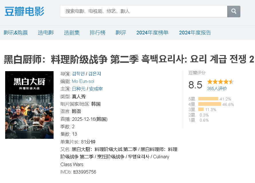 | ▲중국 최대 리뷰 사이트 더우반에 만들어진 '흑백요리사2' 페이지 |