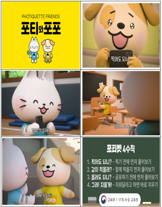 이번에 배포된 3D 애니메이션은 상대방의 동의에 기반한 촬영 예절인 ‘포티켓 실천 4수칙’을 핵심 주제로 한다. ‘찍어도 되니?’, ‘같이 찍을래?’, ‘올려도 되니?’, ‘그래, 지울게!’라는 네 가지 질문을 중심으로, 촬영 전·후 반드시 지켜야 할 기본 원칙을 학생들이 자연스럽게 이해할 수 있도록 구성했다. 특히 교육부가 자체 개발한 캐릭터 ‘포티(POTI)’와 ‘포포(POFO)’를 활용해 흥미 요소를 높이고, 교실 수업이나 생활지도 시간에 바로 적용할 수 있도록 현장 친화성을 강화했다.