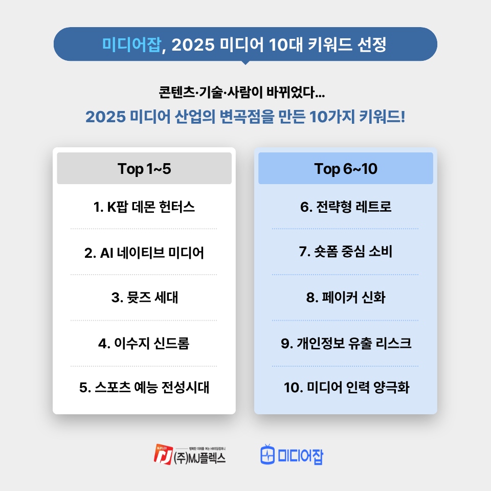 방송미디어 전문 취업플랫폼 미디어잡은 한 해 동안의 콘텐츠 트렌드와 산업 구조 변화를 종합 분석해 ‘2025년 미디어잡 선정 10대 키워드’를 발표하고, 올해를 K-콘텐츠 글로벌 확장, AI 네이티브의 일상화, 숏폼 중심 소비 구조의 고착, 미디어 인력 시장 재편이라는 네 가지 구조적 변화가 맞물린 전환의 해로 진단했다.