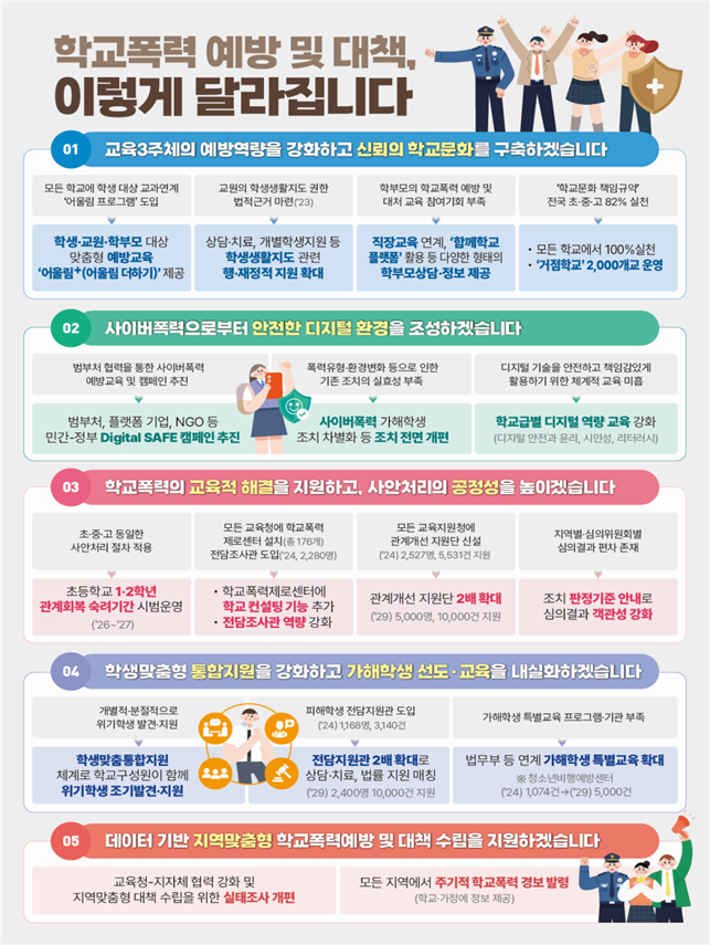 가해학생에 대한 조치도 실질적인 변화가 예고됐다. 출석정지 이상의 조치를 받은 가해학생에 대해서는 법무부, 경찰청과 연계해 차별화된 특별교육을 제공하며, 조치의 효과성과 재발 방지를 꾀한다. 피해학생을 위한 전담지원관은 현재 1,168명에서 2029년까지 2,400명으로 2배 이상 늘어난다. 이들은 학생이 원하는 장소에서 1대1 맞춤 상담과 연계를 제공한다.