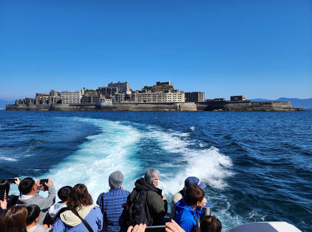 <사진: 유람선에서 군함도를 바라보는 관광객들>