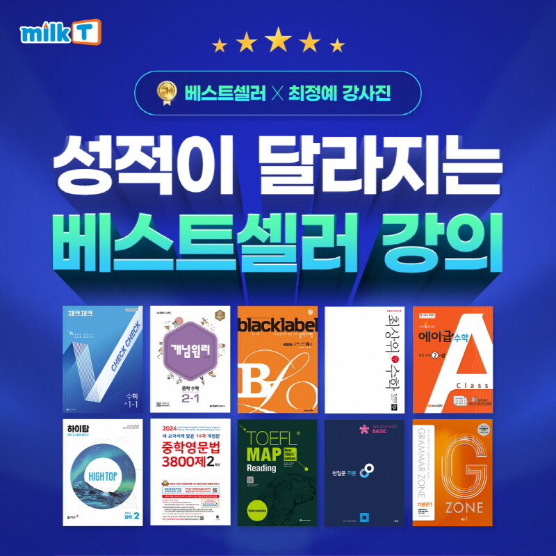 밀크티중학은 △에이급 수학 △블랙라벨 △최상위 수학 등 상위 1%를 위한 중학교 수학 문제집부터 △중학 영문법 3800제 △천일문 등 탄탄한 영어인강 라인업까지 모두 갖추고 있다.