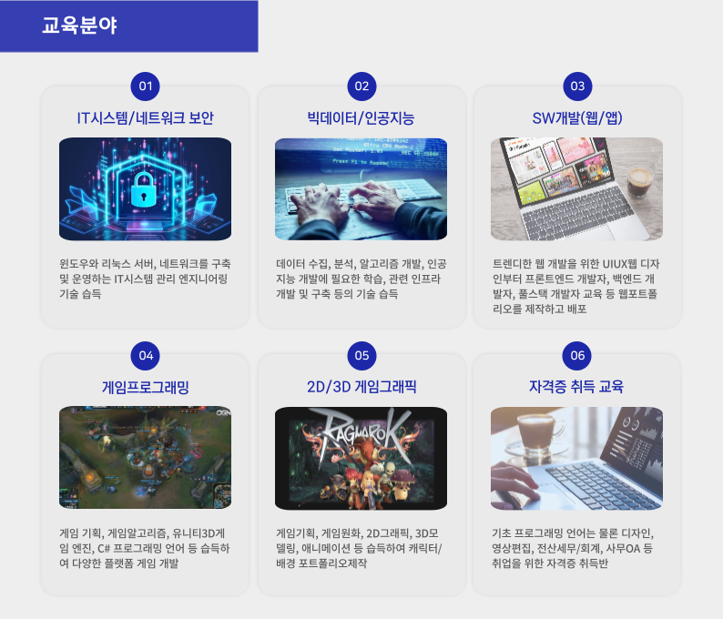 이외에도 산업구조변화대응특화훈련, 국가기간‧전략산업직종훈련, 과정평가형 자격훈련, 일반고 특화 훈련 등을 운영하고 있다. 직업능력개발훈련 심사평가 결과, 2024년에도 연세IT미래교육원은 전 직종을 모두 승인받아 운영을 이어갈 예정이다. 운영 과정으로는 ▲정보시스템구축(개발, 운영) ▲빅데이터 분석 및 UI 전문가 ▲게임콘텐츠제작 ▲스마트웹&콘텐츠개발 등의 과정이 있으며, 자바(JAVA), 파이썬(Python), C# 등 기초 프로그래밍 과정도 신규 개설을 앞두고 있다.