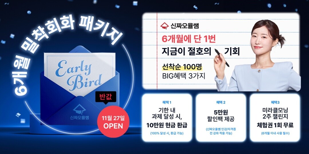 한편 신짜오율쌤은 ‘6개월 밀착회화 패키지’ 강의 오픈 기념 이벤트로 홈페이지를 통해서 12월 10일까지 반값 할인과 함께 기한 내 과제 달성 시 10만원 현금 환급, 5만원 할인팩 제공, 미라클모닝 2주 챌린지 체험권 1회 무료 제공 등 선착순 100명에 한해 얼리버드 이벤트를 진행한다.
