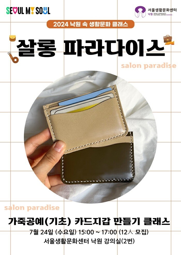 가죽공예(기초) ‘카드지갑 클래스’는 가죽 재료와 쓰임을 이해하고 가죽 바느질 방법까지 쉽게 배울 수 있는 프로그램이며 실생활에서 가장 많이 사용하는 카드, 명함 등을 수납할 수 있는 지갑을 만든다. 입문, 초보자분들도 완성도 높게 제작할 수 있으며 가죽 색상 선택부터 모든 과정을 본인의 취향을 담아 만들 수 있다. 신청 및 접수는 서울생활문화센터 낙원 홈페이지에서 자세한 사항을 확인할 수 있다.