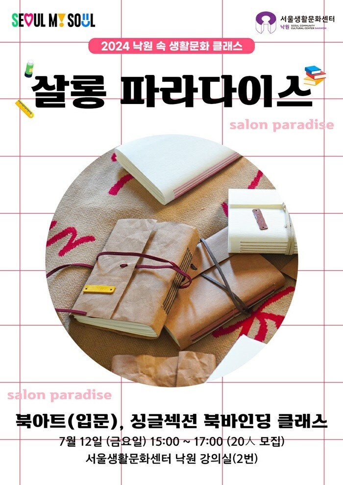 낙원 속 생활문화클래스 7월 ‘살롱 파라다이스’는 공예를 주제로 북 아트(입문) ‘싱글섹션 북바인딩 클래스’와 가죽공예(기초) ‘카드지갑 만들기 클래스’가 운영된다. 실생활용품을 만드는 과정을 배움으로 나만의 취향과 감각이 반영된 특별한 생활문화를 즐길 수 있다.