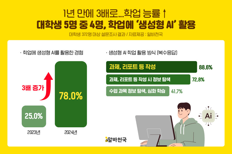 ‘알바천국’이 실시한 조사에 따르면, 대학생 372명 중 78.0%가 실제 학업에 생성형 AI를 활용한 경험이 있다고 응답해, 지난해 동일 조사에서 25.0%였던 것과 비교해 약 3배 증가한 수치를 기록했다.