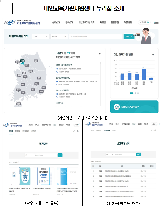 또한 대안교육기관 학생들이 안전한 환경에서 학습할 수 있도록 일반 초·중·고등학교에서 사용하는 예방교육 자료와 관련 누리집 정보도 제공된다. 해당 자료에는 안전사고, 학교폭력, 사이버 폭력, 디지털 성범죄 예방 등이 포함된다.