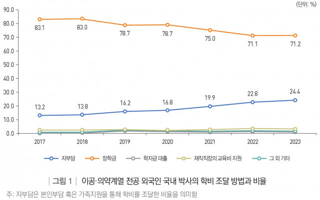 이공·의약계열 외국인 박사의 학비에서 장학금이 차지하는 비율은 2017년 83.1%에서 2023년 71.2%로 감소한 반면, 자부담(본인부담 혹은 가족지원) 비율은 13.2%에서 24.4%로 증가했다. 또한, 이공·의약계열 학업전념 외국인 박사의 연구프로젝트 참여 경험은 최근 7년 평균 76.0%(2.72개)로, 동일 계열 내국인 박사(93.9%, 5.72건)보다 낮은 것으로 나타났다.