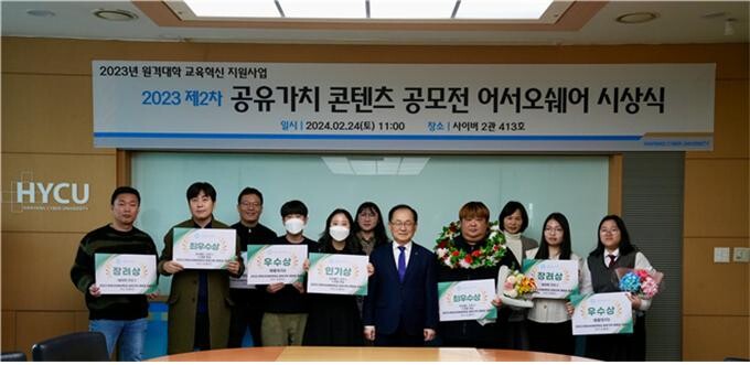 [피앤피뉴스=마성배 기자] 한양사이버대학교 공유가치교육플랫폼사업단(단장 오성근)은 지난 24일 제 2회 공유가치콘텐츠 공모전 「어서 오쉐어」 시상식을 개최했다고 밝혔다.
