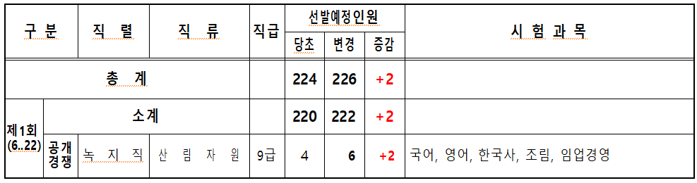 선발인원 추가 직렬은 6월 22일 시행 예정인 제1회 공채 녹지직 산림자원 9급으로, 당초 4명에서 6명으로 증원한다.