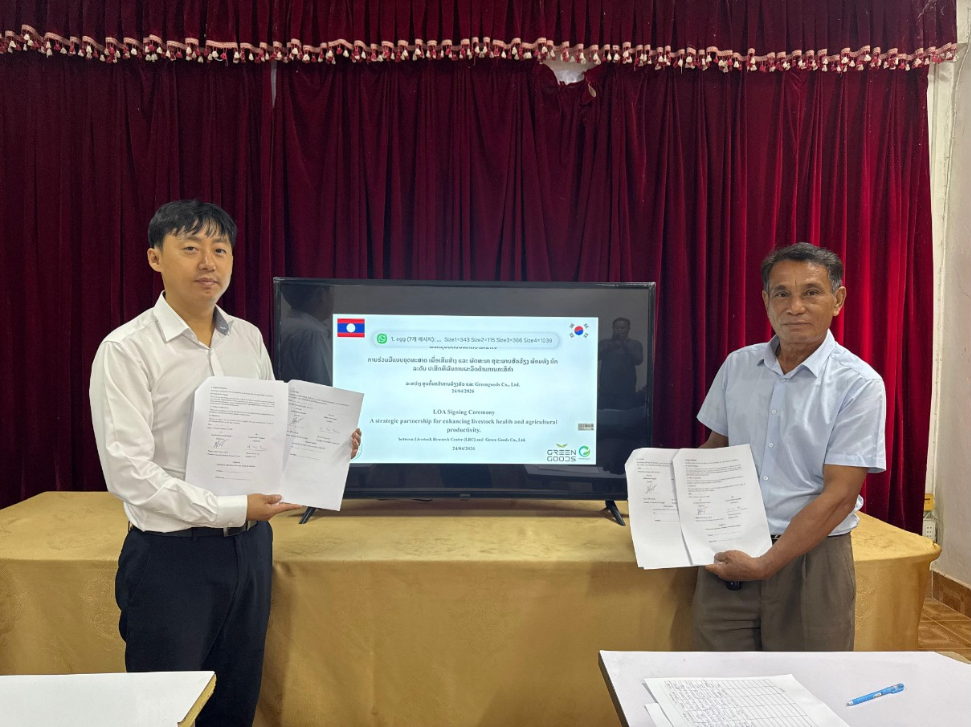 라오스 기반 애그리테크 소셜벤처 그린굿스 주식회사(Green Goods Co., Ltd., 대표 이재원)는 2026년 4월 24일 라오스 국립농환경연구소(NARI) 산하 국립축산연구소(Livestock Research Center, LRC)와 양계 분야 연구 협력서(Letter of Agreement, LOA)를 공식 체결했다고 밝혔다.