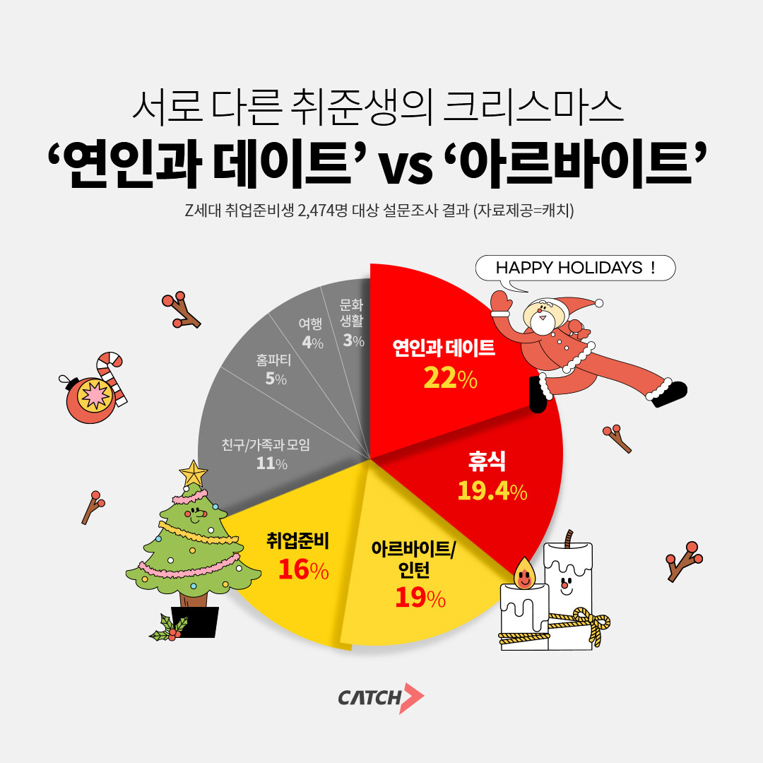 진학사 캐치가 취준생 2,474명에게 ‘올해 크리스마스 계획’에 관해 물었더니 ‘연인과 데이트’라고 답한 경우가 22%로 가장 많았고. ‘휴식’이 19.4%로 뒤를 이었다.