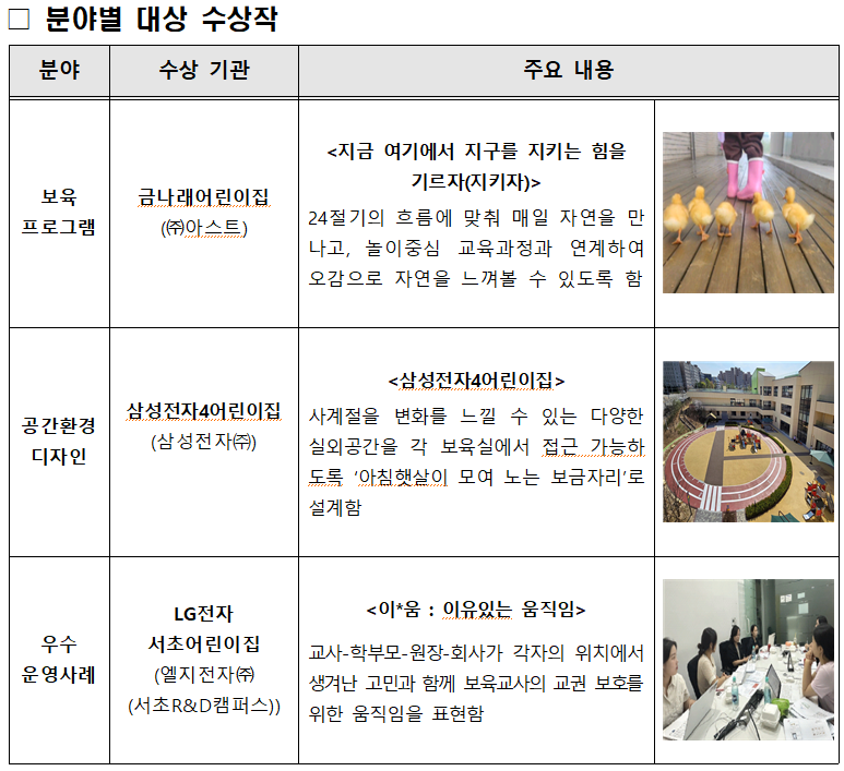 보육프로그램 분야의 대상인 고용노동부 장관상은 ㈜아스트의 금나래어린이집이 수상했다. 금나래어린이집의 “지금 여기에서 지구를 지키는 힘을 기르자” 프로그램은 24절기에 맞춰 놀이 중심 교육과정을 운영하며, 아이들이 자연을 체험할 수 있도록 설계돼 심사위원들로부터 호평을 받았다.