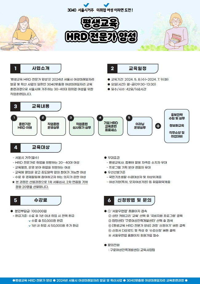 구로여성인력개발센터 ‘평생교육 HRD 전문가 양성’ 과정에 대한 교육 신청 및 관련한 자세한 사항은 센터 홈페이지 및 전화 문의를 통해 확인할 수 있다.
