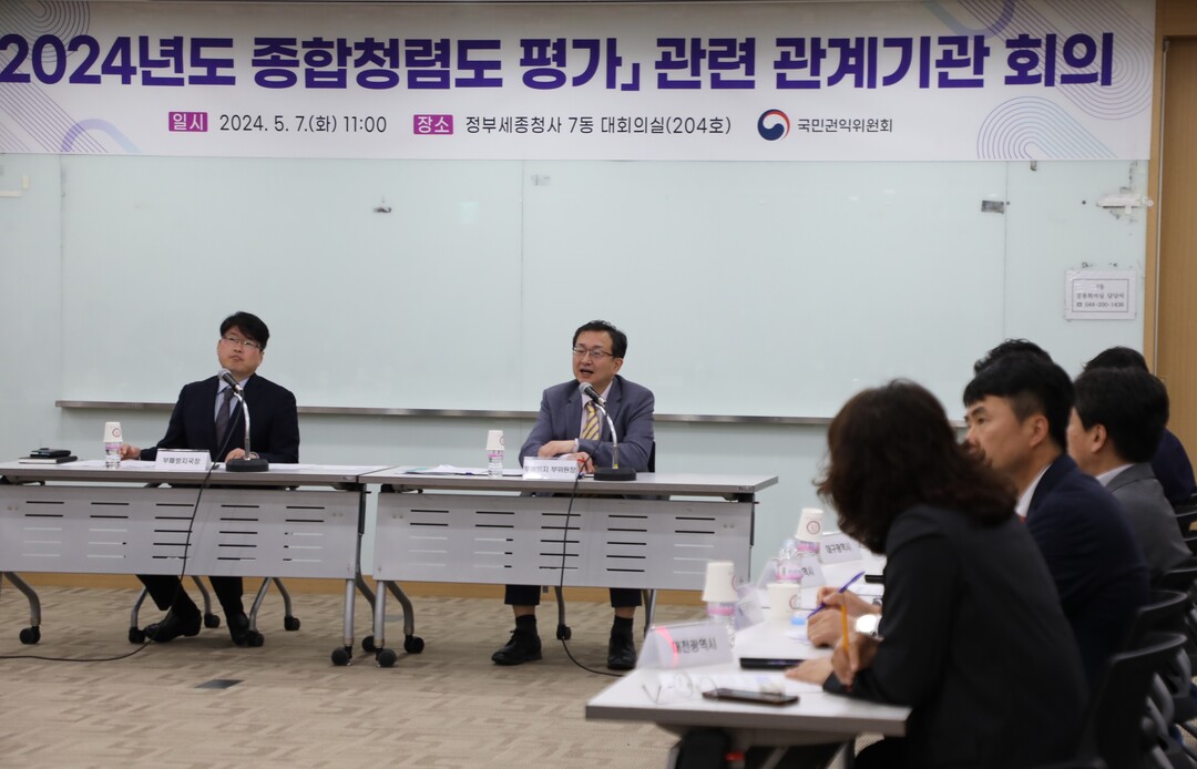 <정승윤 국민권익위원회 부위원장 겸 사무처장이 5월 7일 정부세종청사에서 열린 2024년도 종합청렴도 평가 관련 관계기관 회의에 참석해 인사말을 하고 있다.>