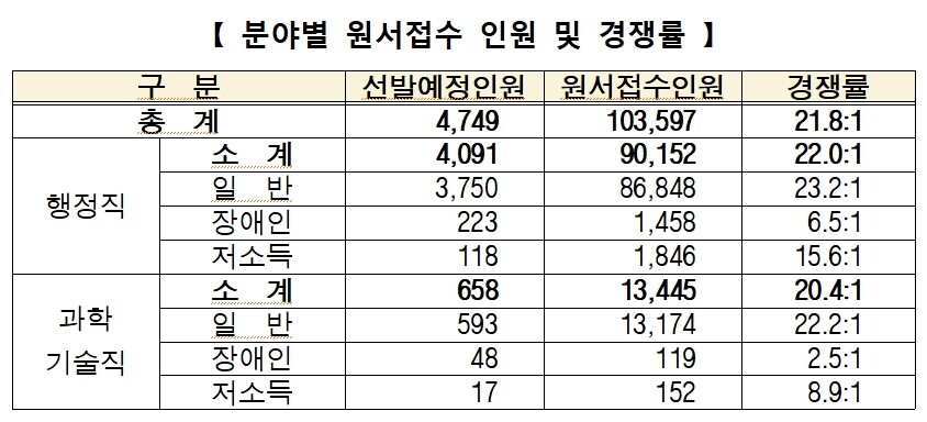 선발 분야별로는 행정직군 4,091명 선발에 9만 152명이 지원해 22.0:1, 과학기술직군은 658명 선발에 1만 3,445명이 지원해 20.4:1의 경쟁률을 보였다.
