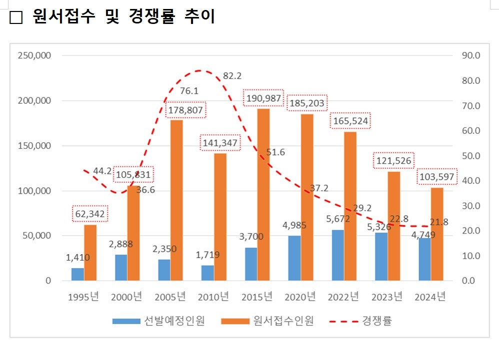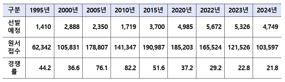 지난해 총 5,326명 선발에 12만 1,526명이 지원한 것에 비해 1만 7,929명이 감소했으나, 최근 지원자 감소 폭(2022년 3만 2,586명, 2023년 4만 3,998명)과 비교하면 다소 둔화된 것으로 나타났다.